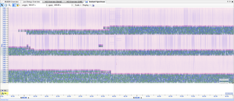 The spectrum display offered by the Ellisys sniffer is the perfect tool for coexistence debugging, wireless characterization, or simply for visualizing the RF environment. It captures the spectrum signal strength (RSSI) in all Bluetooth channels with a configurable precision of up to 1 microsecond, and displays this information in synchronization with the Bluetooth packets.