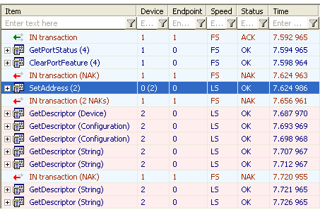 This example shows intermingled enumerations of two peripherals. We can distinguish a hub in blue and a mouse in red.