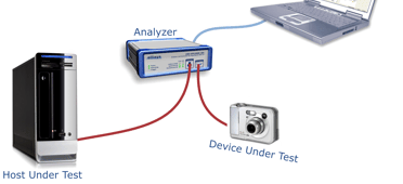 The USB Explorer 280 Generator is connected through a USB Explorer 280 Analyzer to a USB device. The Generator emulates the automated protocol processes of the USB host, while allowing the user full control over these processes, including arbitrary packet and error generation. The Analyzer records all traffic and gives realtime performance and compliance information.